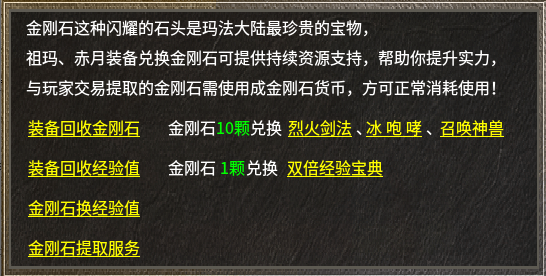 在“不卷氪金”的《枫心传奇》里,金刚石是最核心的硬通货,用于兑换技能书、双倍经验宝典或直接兑换经验,通过回收祖玛、赤月等高级装备即可获得。技能书如烈火剑法、冰咆哮等均可以十颗金刚石兑换,显著提升战斗能力——毕竟在复古设定中,等级提升至关重要,金刚石的合理使用最能帮助玩家领先一步。