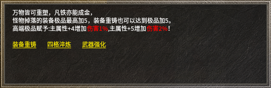 除了打怪刷宝外,玩家还可通过庄园铸炼师用三件相同装备重铸小极品(仅限战神、法神、天尊系列及记忆、灯笼、白色虎齿项链)。
