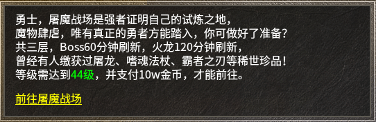 另外,游戏还提供了一些特色玩法,比如怪物强度很高的屠魔战场可获取屠龙系列装备;PVE玩累了又不想真刀真枪PVP的话,可以去武林大会点到为止地大战一番;还有参与行会争霸去争夺屠龙级武器的奖励,重现团队荣耀与归属感,等等。