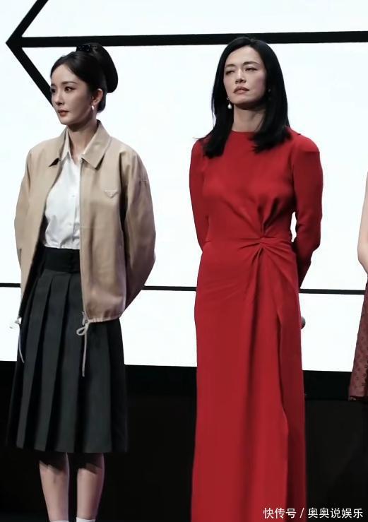 旁边的姚晨一身红色长裙,五官大气齐肩发搭配着也很犀利,人一出现,让人看到的只有两个字“女王”!不愧是老一辈严选,不像是现在的网红脸,姚晨漂亮的别具一格。个子高挑的她虽然已经46岁,但仍英气十足,丝毫不输旁边的杨幂。