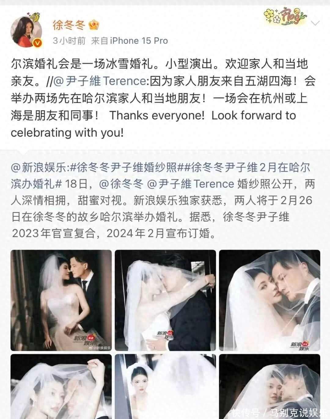2025年12月18号,徐冬冬在社交平台发布婚纱照片,她和尹子维站在哈尔滨的雪景里,两人穿着简单的礼服,没有请明星助阵,笑得自然,网上讨论很多,但没人说他们炒作,毕竟之前订婚和复合都很低调,这次突然公开,反而显得真实。